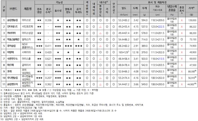 냉감패드 11개 제품 품질 비교…접촉냉감·쾌적성 성능 제품별 차이