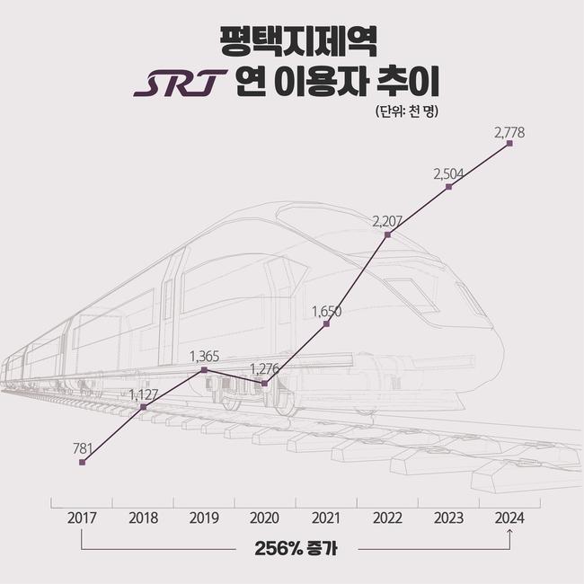 평택지제역은 2016년 개통 당시부터 SRT가 정차한 역사로, 매년 이용객 수가 꾸준히 증가하고 있다. 실제 '철도연감'에 따르면 평택지제역의 연간 SRT 승하차 인원은 2017년 78만 1천 명이었지만, 2024년에는 277만 8천 명으로 256%의 증가율을 기록했다. 이러한 증가율은 SRT 역사 중 가장 높은 수치다.