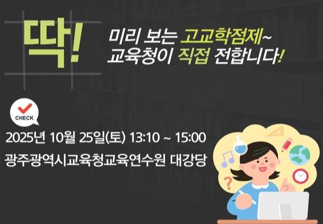광주시교육청(교육감 이정선)은 오는 25일 오후 1시 광주시교육청교육연수원 대강당에서 중학교 3학년 학생 학부모를 대상으로 '고교학점제 설명회'를 개최한다.