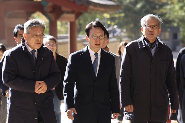 김민석 국무총리가 지난 10일 서울시의 종묘 앞 고층건물 허용과 관련 허민 국가유산청장, 유홍준 국립중앙박물관장 등과 함께 종로구 종묘를 방문, 외부 조망을 점검하고 있다.