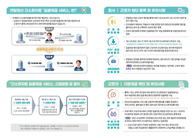 국세청은 근로자가 직접 공제자료를 회사 시스템에 업로드할 필요 없이 국세청이 회사에 간소화자료를 일괄 제공하는 서비스를 운영하며, 올해도 1차 신청기한을 11월 30일로 정해 접수를 받고 있다. 지난해에는 7만7천 개 회사, 270만 명의 근로자가 해당 서비스를 이용해 서류 제출 절차를 크게 간소화했으며, 연말정산 집중 시기 시스템 과부하를 줄이는 데도 효과가 있었다.