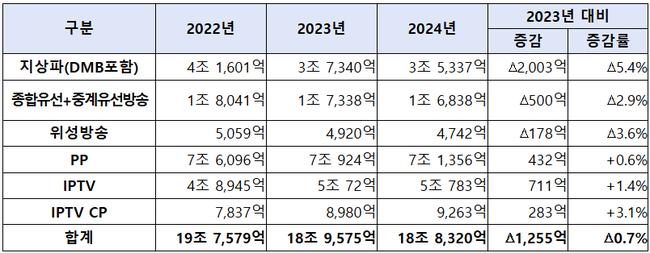 광고 매출은 2조 3,073억 원으로 전년보다 1,832억 원 줄었다. 지상파 광고는 8,363억 원으로 9.9% 감소했고, PP 광고는 1조 2,666억 원으로 17.4% 줄었다. IPTV 광고도 635억 원으로 12.2% 감소했다. 지상파의 경우 TV수신료 분리징수 시행 영향으로 텔레비전방송수신료가 6,694억 원으로 5.0% 감소한 것으로 나타났다.