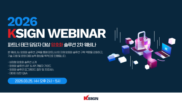 정보보안 전문기업 케이사인(대표 구자동·최현철)은 ‘2026 케이사인 파트너 테크 담당자 대상 암호화 솔루션 2차 웨비나’를 개최한다고 밝혔다. 웨비나는 3월 25일 오후 2시부터 5시까지 약 3시간 동안 진행된다.