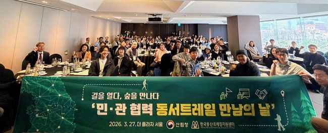 산림청은 27일 서울 더플라자 호텔에서 ‘동서트레일 만남의 날’을 열고 민관 협력 기반 구축에 나섰다. 이 자리에는 산림청과 한국등산·트레킹지원센터를 비롯해 아웃도어 기업, 여행사, 플랫폼 기업 등 관계자 약 90명이 참석해 협력 생태계 조성을 위한 첫 발을 내디뎠다.