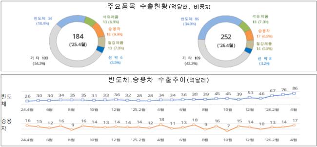 품목별로는 반도체가 전체 수출 증가를 견인했다. 반도체 수출은 전년 동기 대비 152.5% 급증하며 86억 달러를 기록했고, 전체 수출에서 차지하는 비중도 34.0%로 크게 확대됐다. 석유제품(38.6%), 선박(26.6%) 등도 증가세를 보였지만, 승용차(△6.7%)와 자동차 부품(△7.3%)은 감소해 업종 간 온도차가 나타났다.