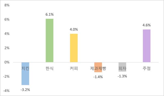 주요 세부 업종 가맹점 수 전년 대비 증가율 (외식 업종)