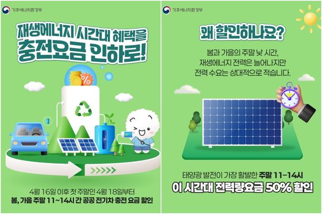 전기차 충전요금 할인도 함께 시행된다. 4월 18일부터 봄·가을 주말 낮 시간대 충전요금이 50% 할인되며, 자가용 충전기 약 9만4,000기와 공공 급속충전기 1만3,000여 기에서 적용된다. 일부 민간 충전사업자도 할인 정책에 참여할 예정이다.
