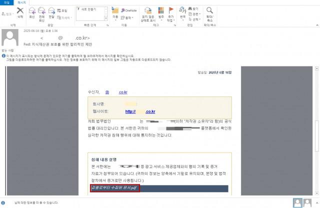 안랩이 공개한 사례에서 공격자는 국내 법무법인을 사칭해 ‘저작권 소유자인 모 기업의 법률 대리인으로서 수신자의 저작권 침해 행위에 대해 통지한다’는 내용의 메일을 발송했다.