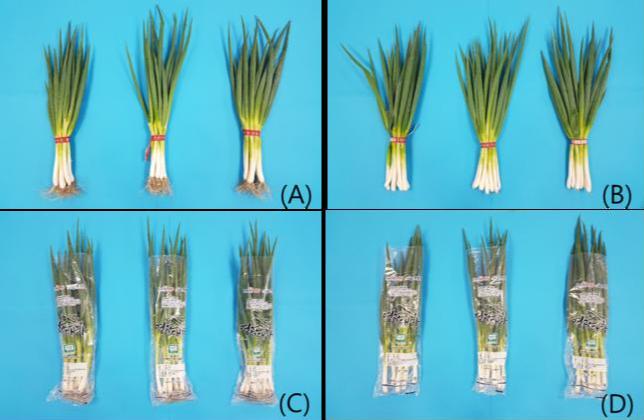 대파 수확 후 뿌리 절단 유무와 포장 방법에 따른 구분 (A) 끈 묶음+뿌리 무절단(S-AR), (B) 끈묶음+뿌리 절단(S-CR) (C) 필름 포장+뿌리 무절단(FP-AR), (D) 필름 포장+뿌리 절단(FP-CR)