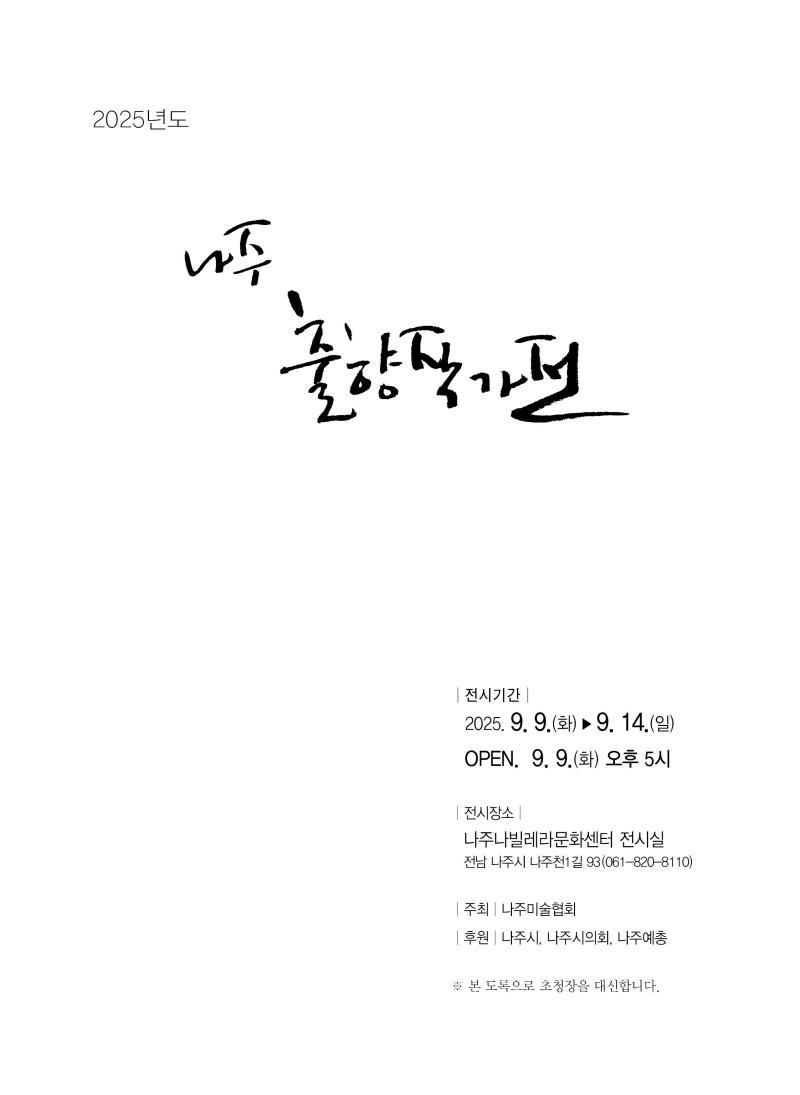 전라남도 나주시(시장 윤병태)가 지역 문화예술 발전과 작가들의 교류를 위해 마련한 ‘2025 출향작가초대전’이 9일(화)부터 14일(목)까지 6일간 나주나빌레라문화센터 전시실에서 열린다.