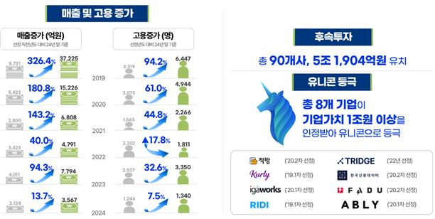 중기부는 2019년부터 2024년까지 총 126개 기업을 예비유니콘으로 선정해 7,972억원의 특별보증을 지원했다. 이들 기업은 매출 174.0%, 고용 44.7% 증가를 기록했으며, 90개사가 총 5.2조원의 후속투자를 유치했다.