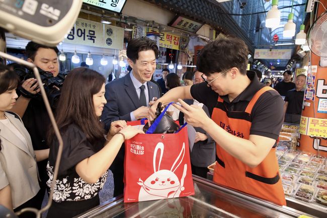 노용석 중소벤처기업부 차관이 1일 경기 수원 못골시장을 방문해 온누리 상품권 가맹점을 둘러보며 상인과 소통하고 있다.