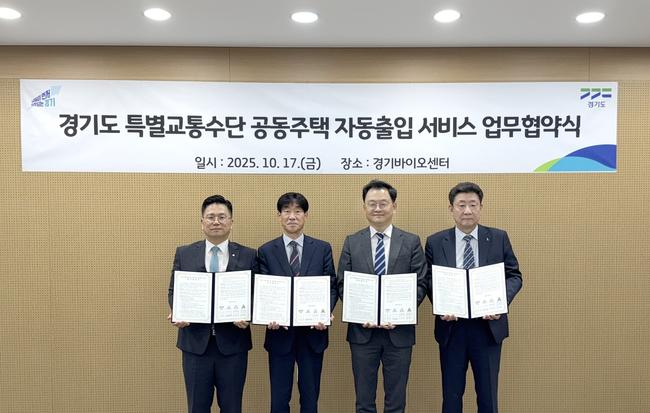 경기도와 경기교통공사, 대한주택관리사협회 경기도회, 전국아파트입주자대표회의연합회 경기도지부는 17일 이런 내용을 담은 '경기도 특별교통수단 공동주택 자동출입 서비스' 도입을 위한 업무협약(MOU)을 체결했다.