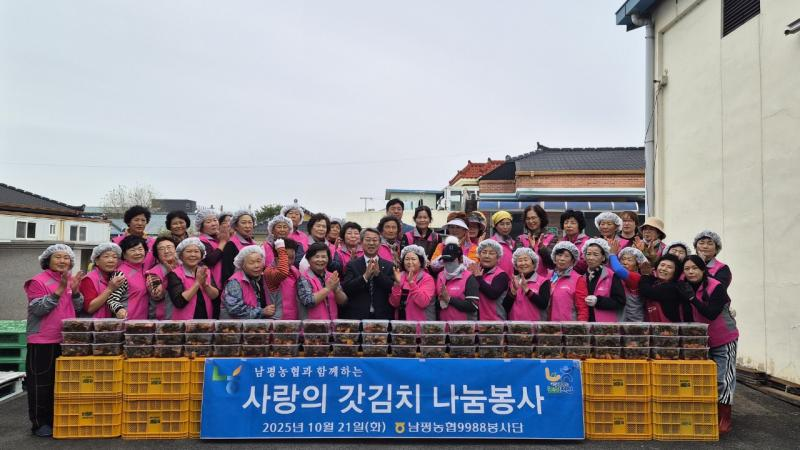 남평농협(조합장 신광섭)은 지난 21일, 9988봉사단(단장 안귀자)과 함께 지역 어르신들을 위한 ‘가을 갓김치 나눔행사’를 진행했다. 이번 행사에는 봉사단원 60여 명이 참여해 갓김치 120단을 정성껏 담갔으며, 이를 336가구의 홀로 사는 독거어르신들께 1통씩(2.7kg) 직접 전달했다.