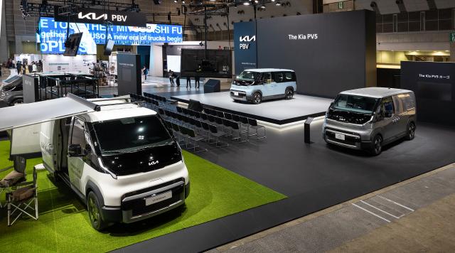 ‘2025 재팬모빌리티쇼’ 기아관 전경. 왼쪽부터 PV5 슈필라움 글로우캐빈, PV5 패신저, PV5 카고
