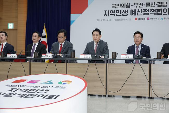 4일 경남 창원시 경남도청에서 열린 국민의힘-부산·울산·경남 지역민생 예산정책협의회에서 국민의힘 장동혁 대표(오른쪽에서 두번째)가 발언하고