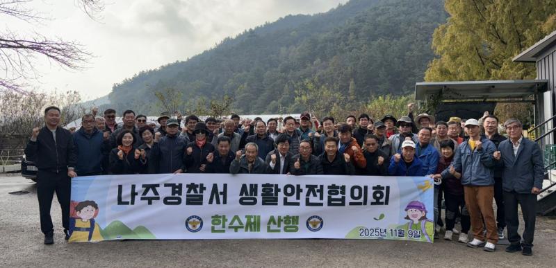 나주경찰서 생활안전협의회 연합회에서는 2025년 한수제 둘레길 산행 행사를 가졌다. 이날 행사에는 각지역의 생활안전협의회 위원들과 나주경찰서 권석진서장 윤병태나주시장 그리고 주민자치위원회 연합회장 등 120여명이 참석한 가운데 주민들의 생활안전에 대한 봉사활동과 연합회의 단합하는 자리로 가을맞이 산행을 하였다.