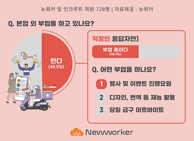 기업 주문형 긱워커 플랫폼 뉴워커가 11월 1일부터 16일까지 728명을 대상으로 실시한 설문에서 직장인의 48.4%가 부업을 하고 있다고 답하며 부업 선택의 최우선 기준으로 ‘시간’을 꼽은 것으로 나타났다.