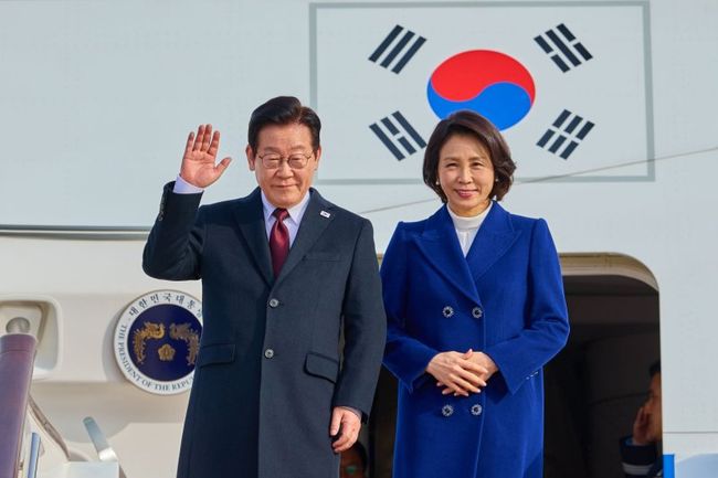 중국을 국빈 방문한 이재명 대통령과 김혜경 여사가 4일(현지 시간) 베이징 서우두 국제공항에 도착해 인사하고 있다.