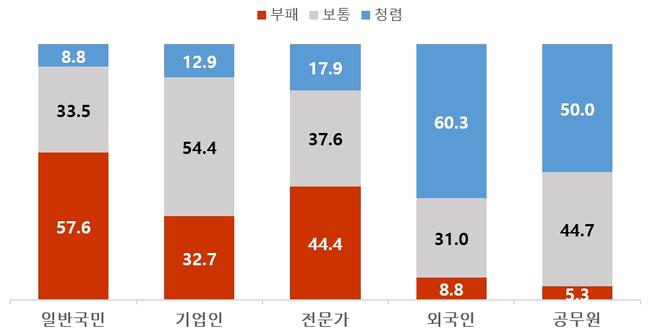 2025년도 조사는 일반국민 1,400명, 기업인 700명, 전문가 630명, 외국인 400명, 공무원 1,400명을 대상으로 6월과 10월 두 차례 진행됐다. 사회 전반에 대해 ‘부패하다’고 응답한 비율은 일반국민이 57.6%로 가장 높았고 전문가 44.4%, 기업인 32.7%, 외국인 8.8%, 공무원 5.3% 순이었다.