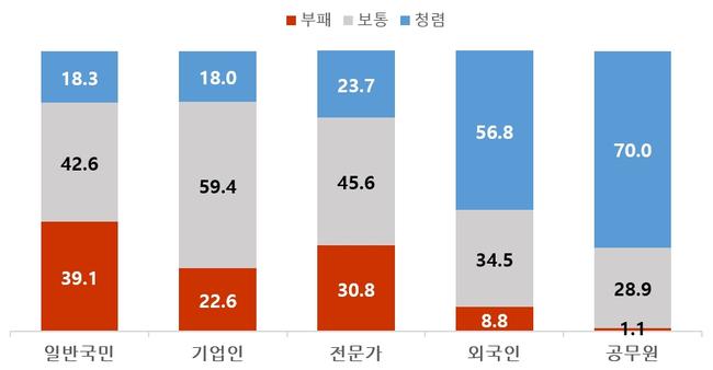 공직사회에 대해서도 ‘부패하다’는 응답은 일반국민 39.1%, 전문가 30.8%, 기업인 22.6%, 외국인 8.8%, 공무원 1.1% 순으로 나타났다. 기업인(31.9%→22.6%), 전문가(36.1%→30.8%), 외국인(14.2%→8.8%), 공무원(3.1%→1.1%) 등은 개선됐지만, 일반국민은 35.5%에서 39.1%로 3.6%p 높아져 체감도 제고가 과제로 제시됐다.