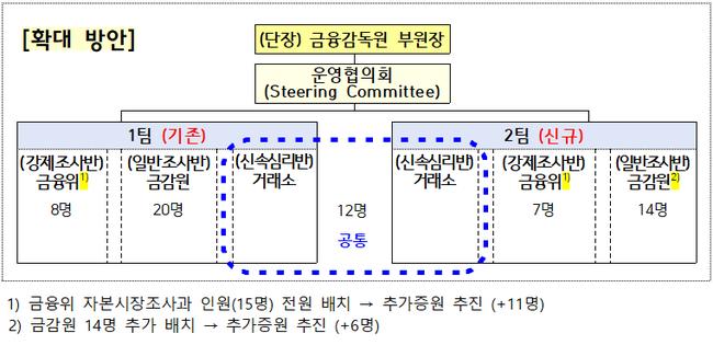 현재 합동대응단은 강제조사반(금융위), 일반조사반(금감원), 신속심리반(거래소)으로 구성된 3반 1팀 체제다. 앞으로는 강제조사반과 일반조사반을 각각 1개씩 신설해 2개 팀을 운영하고, 신속심리반은 두 팀을 공통 지원하는 구조로 확대된다. 1팀 강제조사반에는 금융위 자본시장조사과 소속 인력 8명을 배치하고, 2팀에는 추가로 확보한 조사 인력 7명을 투입할 계획이다.