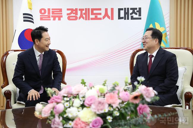 14일 오전 장동혁 당 대표는 대전광역시에 위치한 대전광역시청을 찾아 '대전·충남 통합 관련 당 대표-대전시장 정책협의'를 위하여 이장우 대전광역시장을 만났다.
