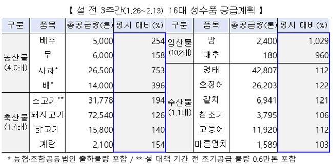 정부는 설 장바구니 물가 안정을 위해 배추·사과·돼지고기 등 16대 성수품을 역대 최대인 27만톤 공급하고, 정부 할인지원도 사상 최고 수준인 910억원을 투입해 최대 50% 할인 판매를 추진한다.