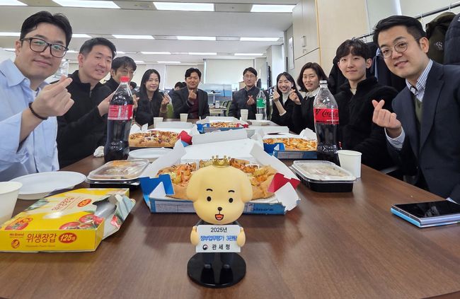 이명구 관세청장이 정부업무평가 3개 부문에서 우수 성과를 달성하는데 기여한 직원들을 격려하기 위해 피자 등 간식을 전달했다