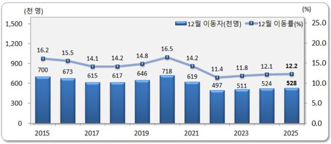 2025년 12월 국내 인구이동은 52만8천명으로 전년 동월보다 0.8% 증가했고, 시도간 이동이 늘면서 경기·충북은 순유입을 기록한 반면 서울은 -4,887명 순유출로 감소 폭이 커졌다.