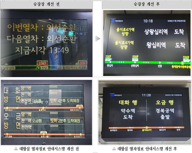 교통약자를 위한 개선도 병행됐다. 시청역 등 9개 역사 19개소에는 엘리베이터 외부 전면과 승강장 내 시야 확보가 어려운 지점에 모니터를 추가 설치했다. 기둥이나 천장 상부 구조물로 열차정보 확인이 불편했던 공간에도 안내 화면을 보강해 접근성을 높였다.