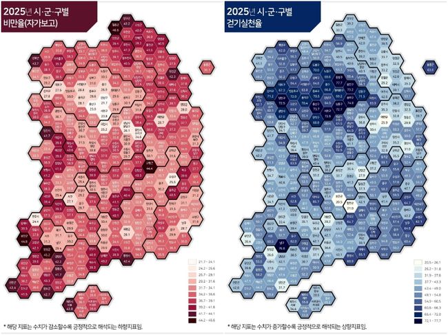 지역별 건강 격차는 여전히 뚜렷했다. 세종시는 담배제품 현재사용률(17.3%), 고위험음주율(7.0%), 비만율(29.4%) 등 주요 지표에서 전국 최저 수준을 기록하며 가장 건강한 도시로 꼽혔다. 반면 충북은 담배제품 현재사용률(24.7%)이 가장 높았고, 강원은 고위험음주율(15.7%)과 걷기 실천율(37.6%, 최저) 부문에서 지표가 좋지 않았다. 시·군·구 단위에서는 경기 과천시가 흡연율과 음주율에서 최저치를 기록한 반면, 강원 철원군의 비만율은 46.6%에 달해 지역 간 불균형을 드러냈다.