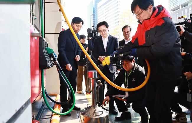 김정관 산업통상자원부 장관이 13일 서울 마포구 도화동에 위치한 SK에너지 직영 주유소를 방문해 관계자로부터 최근 석유 가격 동향을 청취한 뒤 석유제품 가격·품질·유통 검사 과정을 참관하고 있다. 김 장관은 최고가격제 시행 이후 국민이 체감할 수 있는 석유 가격 안정을 위해 판매가격을 안정적으로 유지해 줄 것을 요청했다.